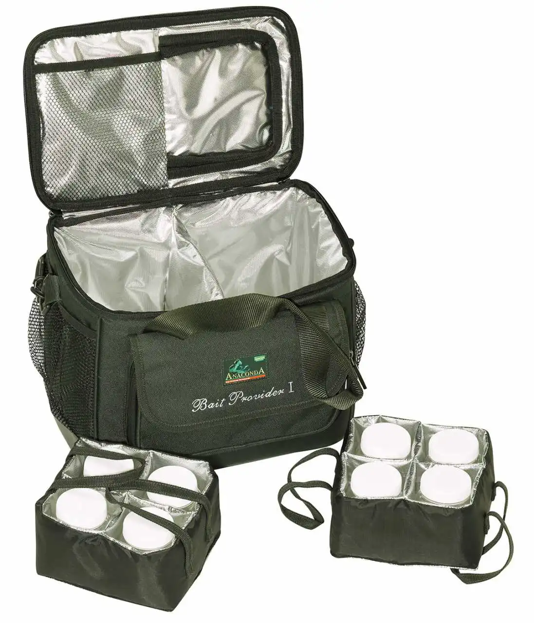 An den Seiten ist je eine Netztasche und an der Vorderseite ist auch noch eine Tasche für Kleinutensilien angebracht. Tragegriffe und Schultergurt lassen den Bait Provider problemlos mobil werden.