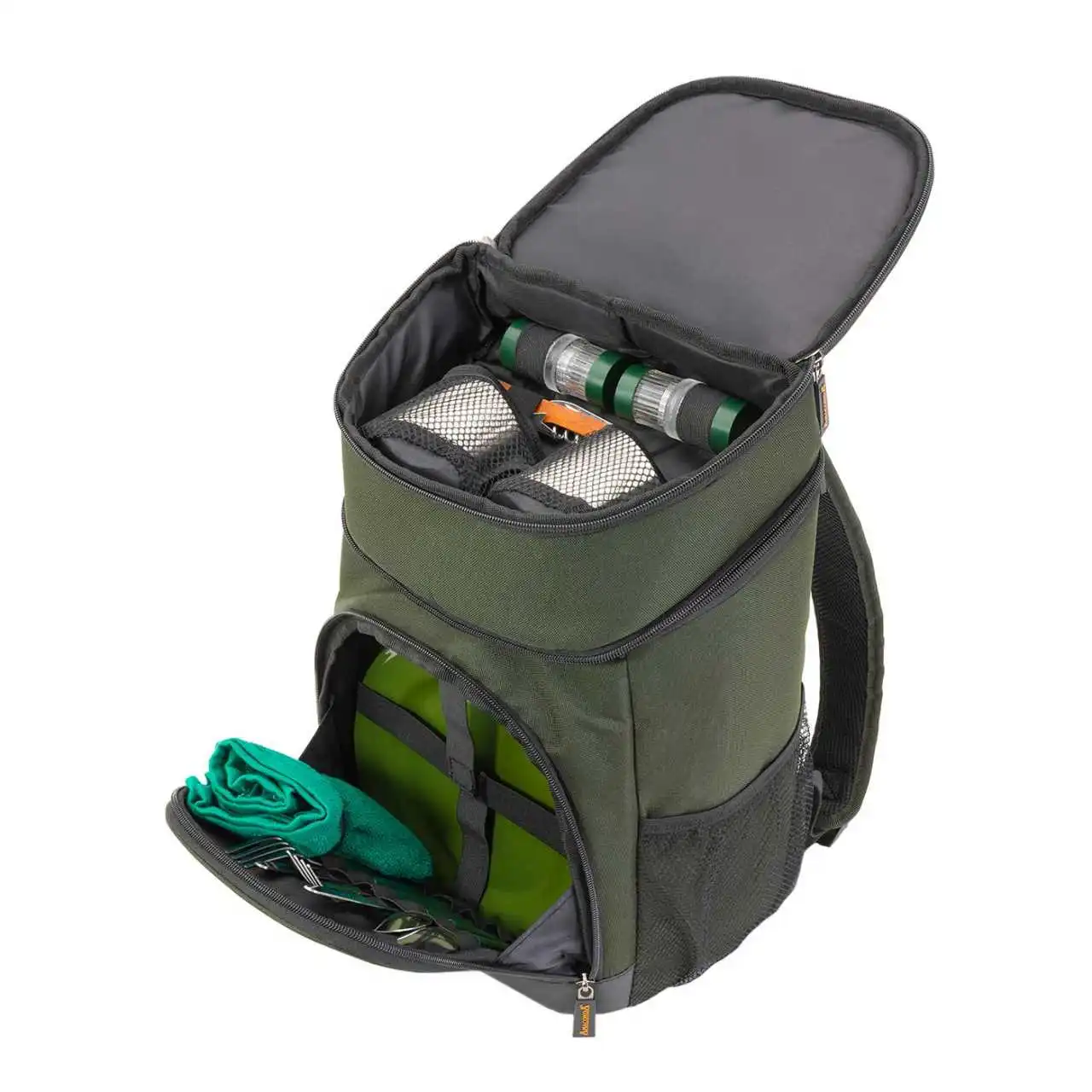 Das zum Lieferumfang dazugehörige Teller, Besteck, Salz- und Pfefferstreuer eignet sich ideal für einen kleinen Snack für bis zu 2 Personen. Der Korkenzieher, das Handtuch und die zwei Metallbecher sorgen dafür, dass man zu zweit auch beispielsweise einen Wein am Wasser genießen kann. Durch das zusätzliche Frontfach und das obere Fach findet alles im Catering Rucksack seinen eigenen Platz. So ist alles aufgeräumt und bereit für den schnellen Einsatz, wenn ein Gast kommt!