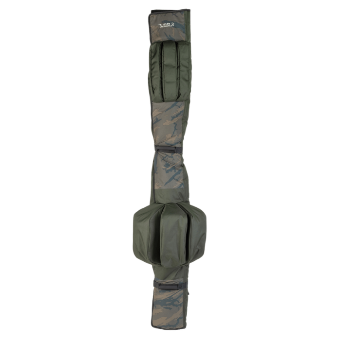 Im Innenteil sind weitere Taschen für Kescher und weitere Utensilien vorhanden, um diese sicher verstauen zu können. Das Futteral besteht aus 600-D-Nylon mit wasserabweisendem Coating. Es verfügt über Klettverschlüsse zur Rutensicherung, zwei Tragegriffe und einen verstellbaren Schultergurt.