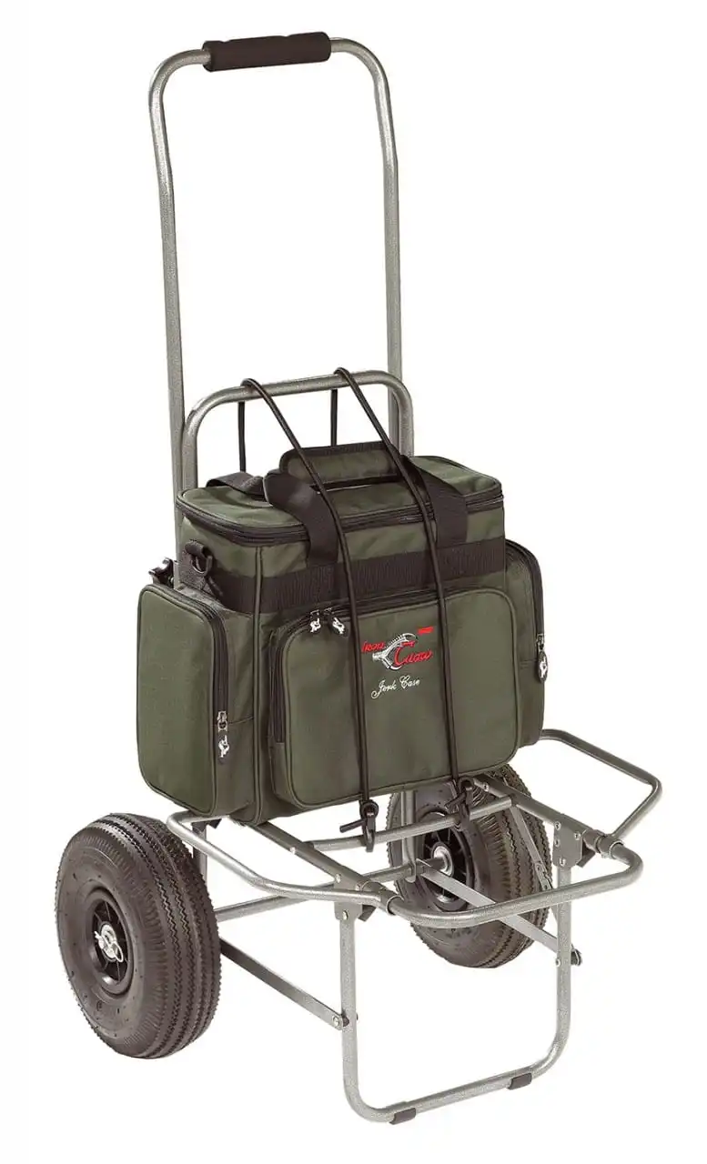 So ein Trolley ist ´ne feine Sache, um viel Tackle zum Angelplatz zu transportieren. Aber wer kennt das nicht, die meisten dieser Trolleys lassen sich aufgrund ihrer eigenen Größe selbst nur schwer transportieren. Deshalb wurde dieses Transportwunder in zweierlei Hinsicht entwickelt. Aufgebaut lässt sich verdammt viel Angelgerät darauf verstauen und transportieren. Zusammengeklappt passt der Trolley in die kleinste Ecke.