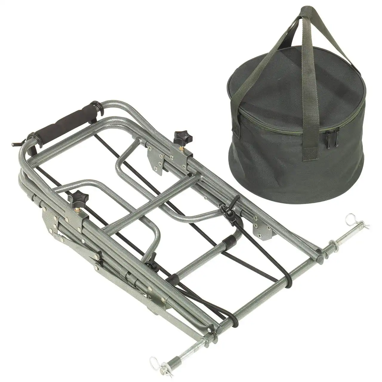 Hergestellt aus pulverbeschichtetem Stahl mit Lufträdern, die sich zum Transport einfach und schnell mit Splinten abnehmen und in der mitgelieferten Tasche verstauen lassen.