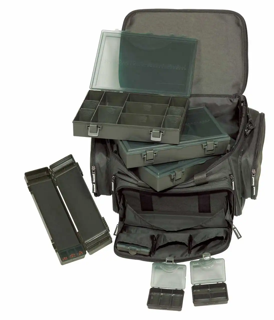 Des Weiteren befinden sich im großen Hauptfach drei Tackle Chest Large, welche durch Klettverschluss fixierte Böden voneinander getrennt sind und von oben heraus genommen werden können.