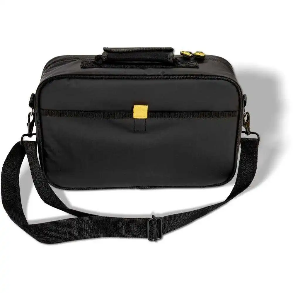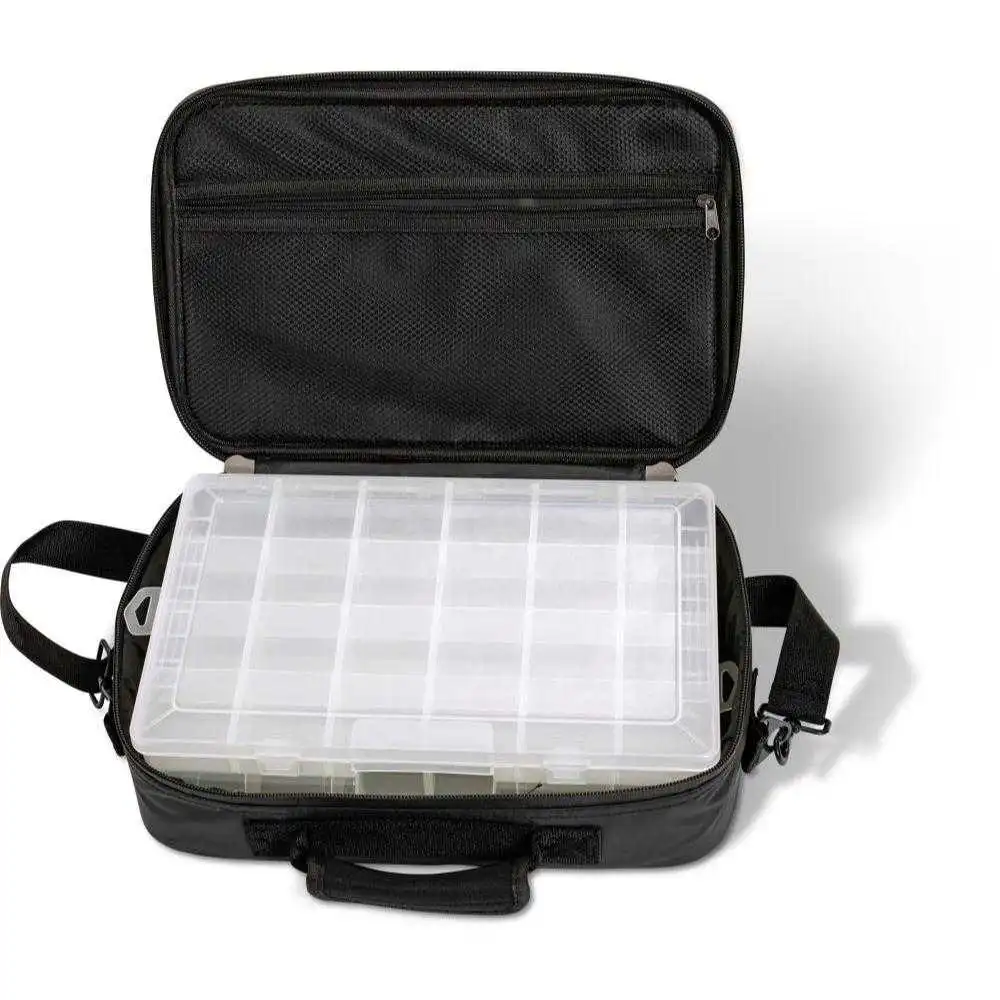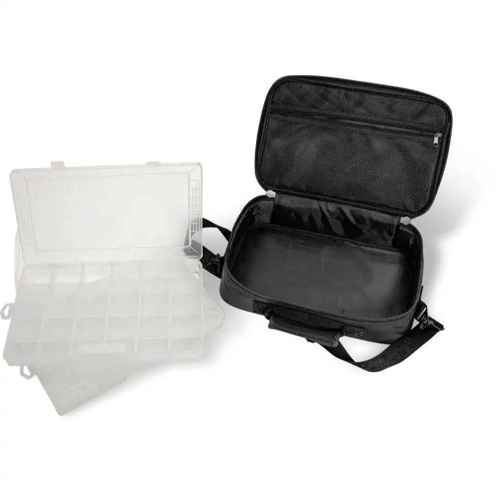 Umhängetasche für Spinn- und Aktivangler mit zwei Plastikboxen, in denen dieAngelköder geordnet lagern und vor Wasser und Schmutz geschützt sind.