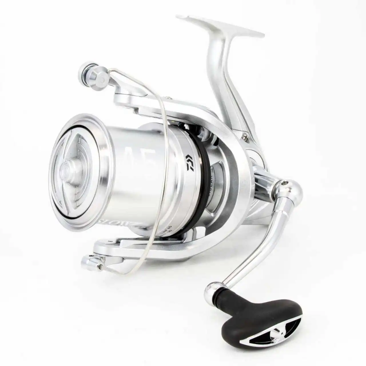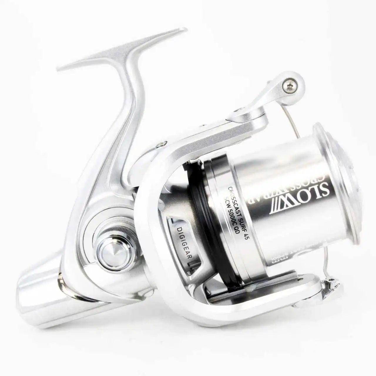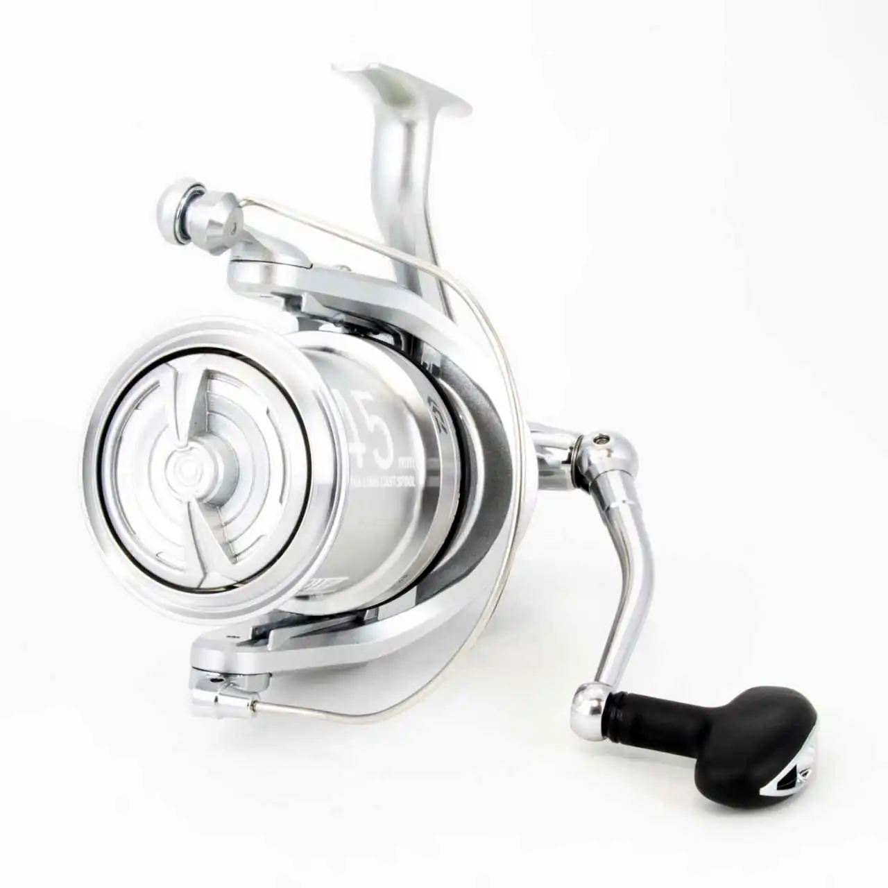 Baugleich wie die neuen 20 CrossCast 45 SCW QD, mit 45mm Spulenhub, Slow Cross Wrap System & Co – aber im silbernen Brandungsangler Design!