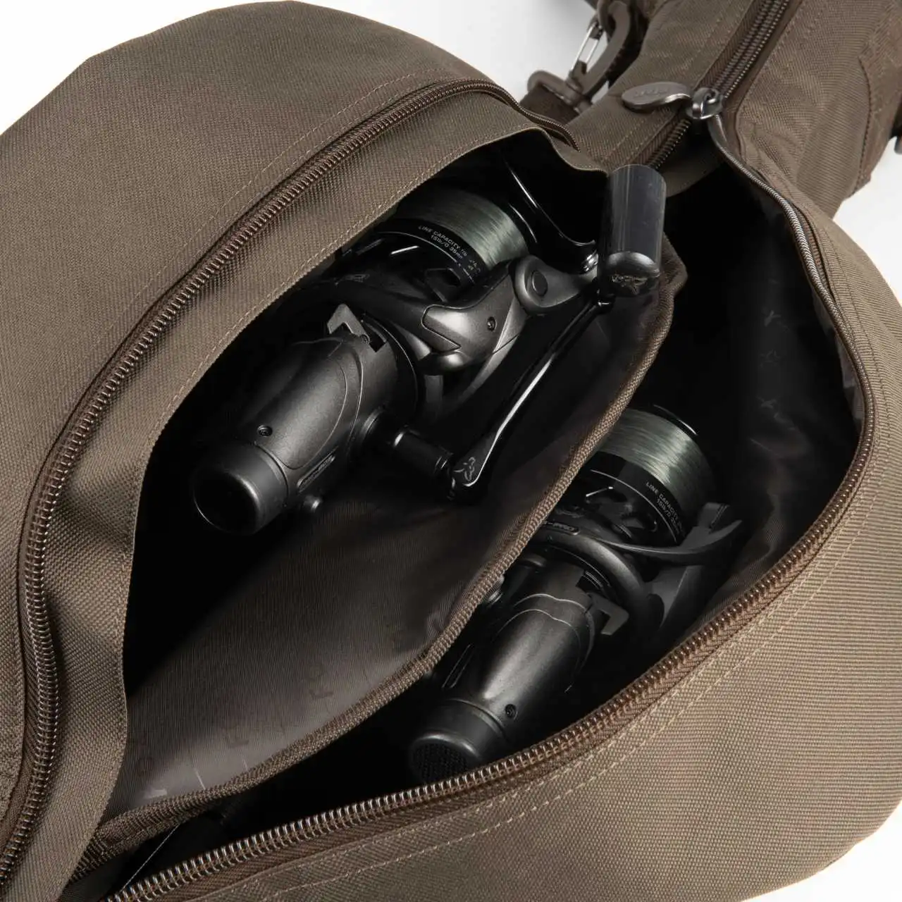Die Rutentasche ist weit ausgestellt passend zur Aufnahme der meisten Rollen inklusive vieler großer Big Pit Rollen. Sie ist mit hochrobusten 10 mm-Doppelreißverschlossen, gepolsterten Innentrennwänden, versteiften EVA-Handtragegriffen und abnehmbarem gepolstertem Schultertragegurt ausgestattet.