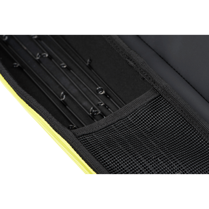 Durch das PVC-beschichtete Gewebe und die hochwertigen PU-beschichteten Reißverschlüsse ist die Tasche extrem wasserfest und langlebig. Die starre Außenwand aus PE dient zum Schutz deiner Ruten während dem Transport. Zusätzlich verfügt die Tasche über einen gepolsterten Schultergurt und zwei Neopren-Tragegriffe.