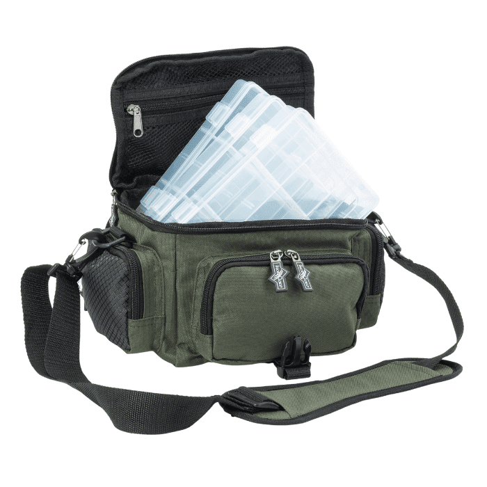 Wenn man am Forellenbach oder mit extrem leichtem Gepäcke zum Barschfischen unterwegs ist, aber trotzdem viele Köder und Zubehör zu verstauen hat, braucht man einen Kumpel, der alles trägt, was man in einer solchen Situation eben braucht. Genau das ist unser Buddy Bag. Im Hauptfach sind drei Tackle Boxen untergebracht.