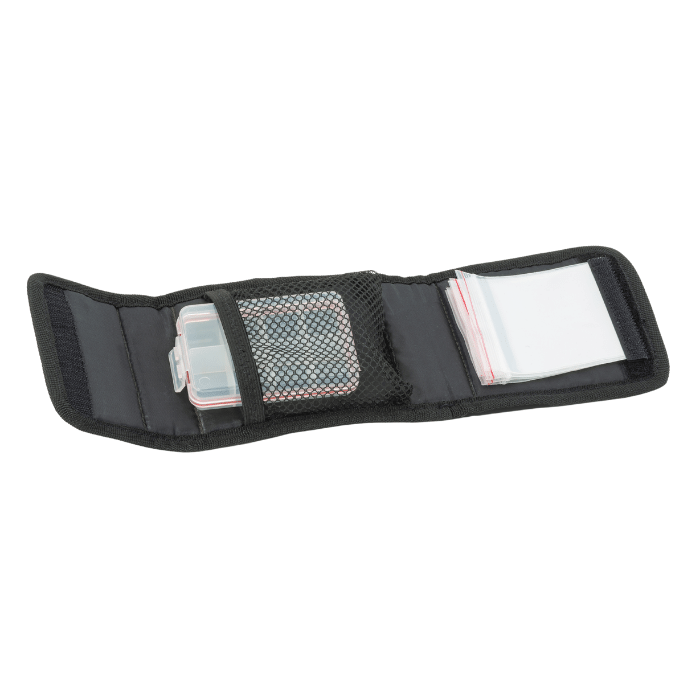 Zweckmäßiges Wallet zur Aufnahme von z.B. Spinnvorfächern. Auf einer Seite mit 5 Klarsichthüllen ausgestattet und inkl. einer Box, welche sich durch ihre Unterteilung hervorragend dazu eignet, Kleinteile wie Wirbel, Quetschhülsen etc. aufzunehmen.
