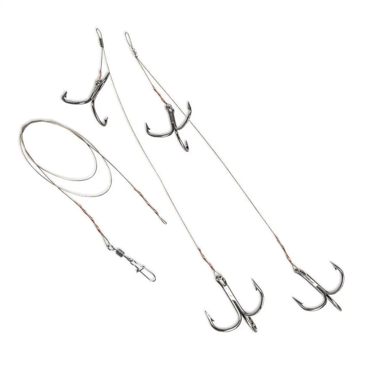 Je nach gewünschter Köderpräsentation wird die Schlaufe des mit zwei Drillingen versehenen Teils an der passenden Stelle einfach mit einer Ködernadel durch den toten Köderfisch gezogen und dann am Karabiner des mitgelieferten Vorfachs befestigt.
