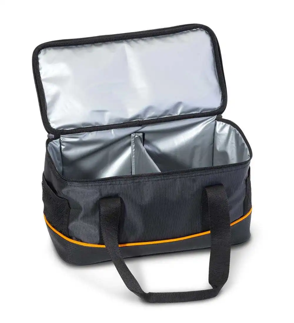 Die Bait Box ist eine Tasche mit isolierender Funktion. Im Inneren befindet sich eine Trennwand. Maden, Caster, Würmer – sämtliche Köder können mit ihr sicher zum Angelplatz transportiert werden. Der Boden ist verstärkt. Seitliche Netzfächer, sowie ein Tragegurt sind ebenfalls vorhanden.