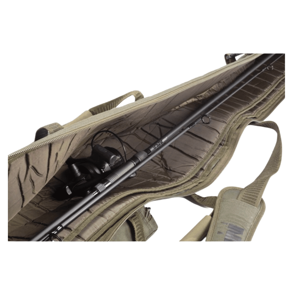 Ausgestattet ist diese Rutentasche mit einer exzellenten, luxuriösen Polsterung, welche deinen Ruten einen Rundumschutz bietet. In der externen, verstärkten Tasche finden Banksticks, Bleie und Receiver Platz. Auch kannst du andere Angeltackles dort unterbringen.