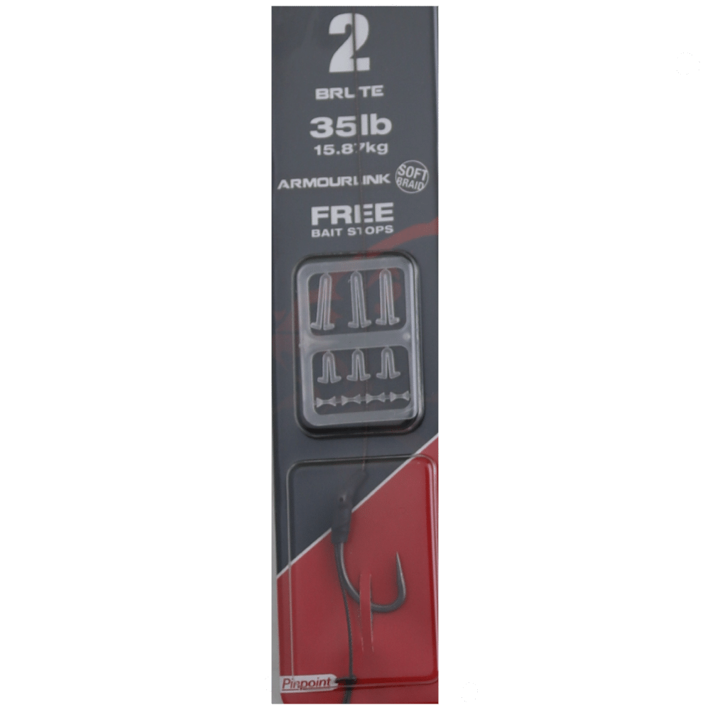 Der unfassbar starke Pinpoint „Brute“ Haken in Kombination mit dem extrem abriebfesten Armourlink-Vorfach-Material. Für herausfordernste Situationen und allergrößte Karpfen, ganz ohne Kompromisse. Schlaufen-Achterknoten für bequemes Wechseln des Rigs. Inklusive drei Größen Stopper (je 3 Stück) für unterschiedliche Köder-Durchmesser.
