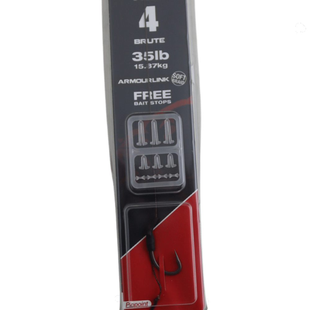 Der unfassbar starke Pinpoint „Brute“ Haken in Kombination mit dem extrem abriebfesten Armourlink-Vorfach-Material. Für herausfordernste Situationen und allergrößte Karpfen, ganz ohne Kompromisse. Schlaufen-Achterknoten für bequemes Wechseln des Rigs. Inklusive drei Größen Stopper (je 3 Stück) für unterschiedliche Köder-Durchmesser.