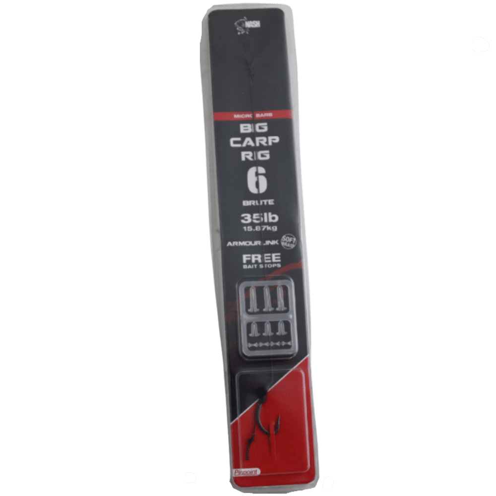 Der unfassbar starke Pinpoint „Brute“ Haken in Kombination mit dem extrem abriebfesten Armourlink-Vorfach-Material. Für herausfordernste Situationen und allergrößte Karpfen, ganz ohne Kompromisse. Schlaufen-Achterknoten für bequemes Wechseln des Rigs. Inklusive drei Größen Stopper (je 3 Stück) für unterschiedliche Köder-Durchmesser.