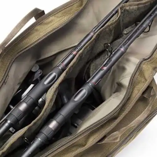 Der Dwarf Double Skin nimmt problemlos zwei montierte Ruten mit Big Pit Rollen auf. Diese liegen in einem mit Reißverschluss verschlossenen und gepolsterten unterteilten Hauptfach. Durch externe Außentaschen mit Schnallen wird die optionale Anbringung weitere einzelner Rutenfutterale am Dwarf Double Skin möglich.