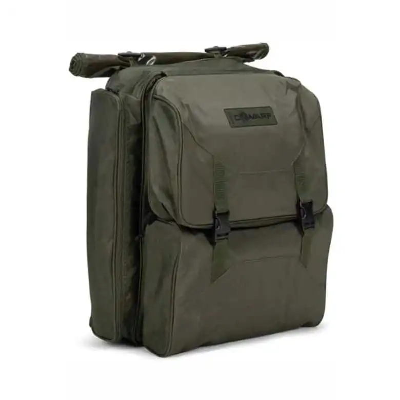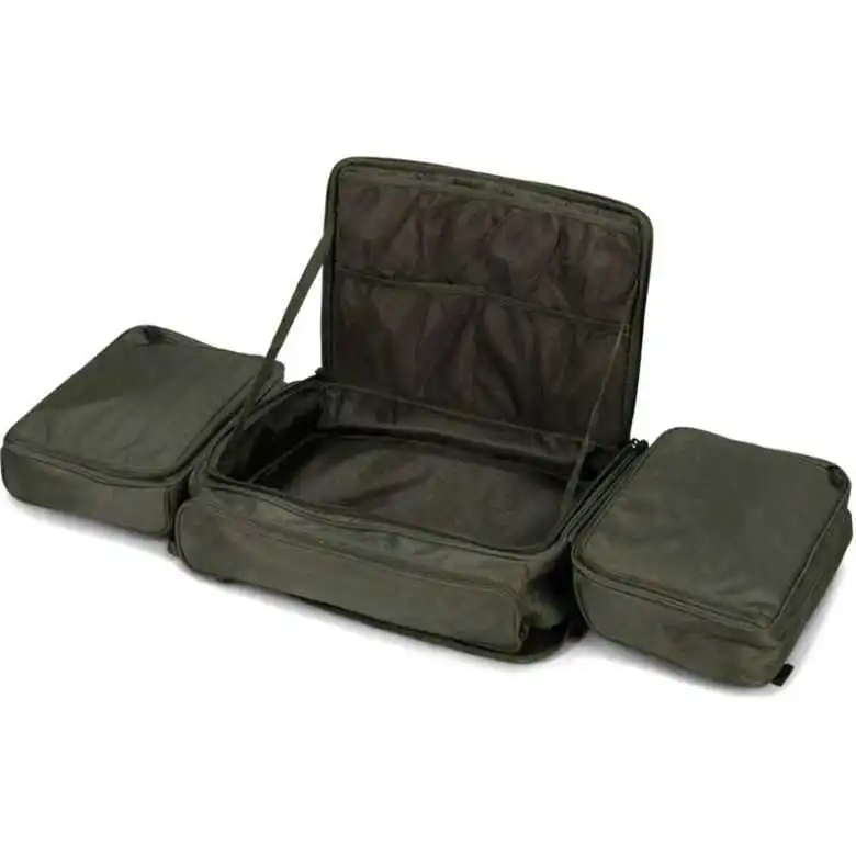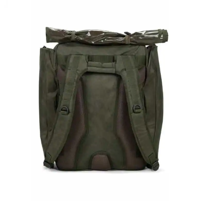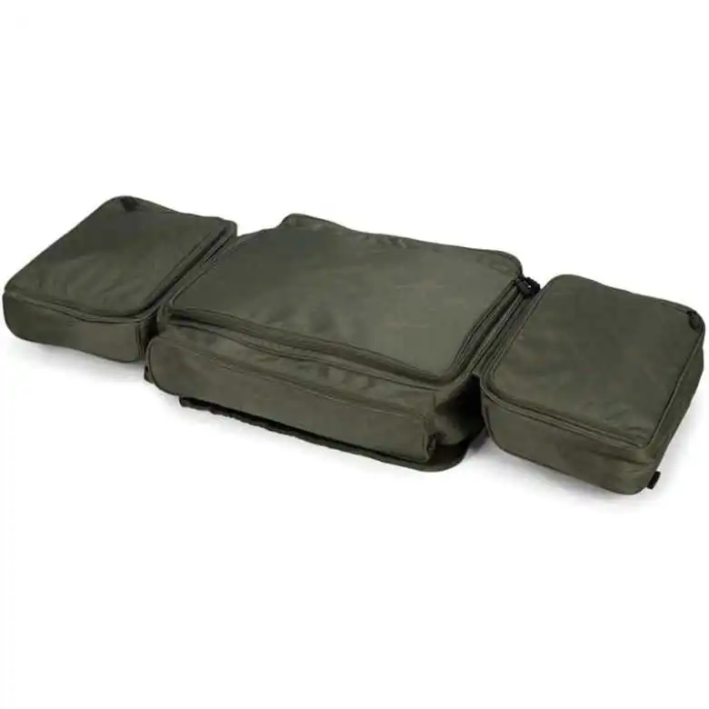 Die Endfächer haben eine wasserfeste Oberfläche, damit sie beim Ausklappen kein Wasser aufnehmen können. Das Hauptfach hat einen Reißverschlussdeckel mit praktischer Aufbewahrungsmöglichkeit auf der Innenseite mit vier kleinen und zwei großen elastischen Netztaschen. Zudem ist das Innenfutter des Ruckall durchgehend mit dem Nash Micro-Fischmuster-Camo bedruckt.