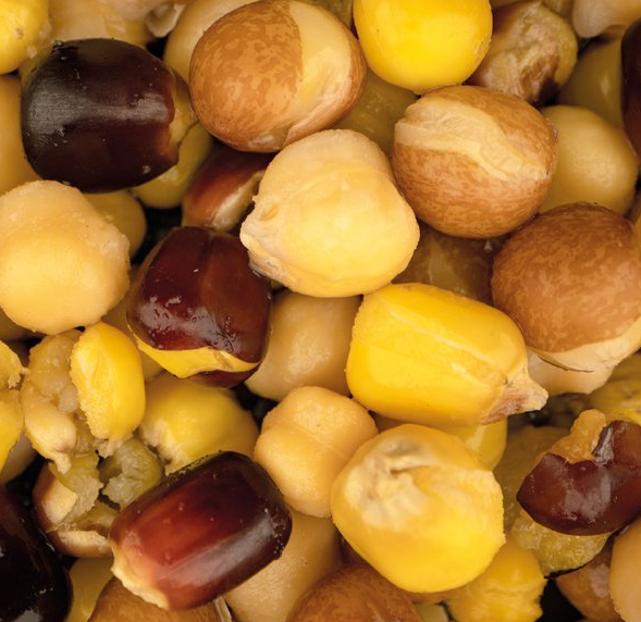Eine Mischung aus Ahornerbsen, Kichererbsen und rotem und gelbem Mais. Die Zugabe von Himalaya-Steinsalz verbessert den Geschmack und verbessert die Ernährung mit wertvollen Mineralien und Spurenelementen.