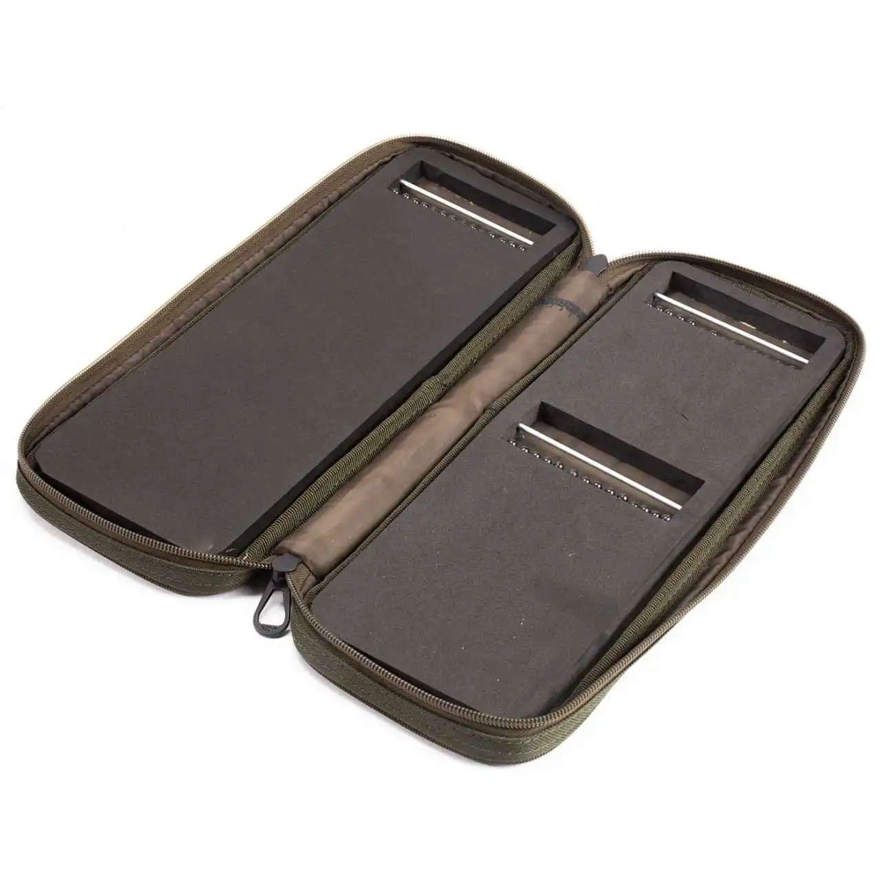 Mit dem Rig Pouch kannst du dich durch fertig montierte Rigs perfekt auf deinen nächsten Angelausflug vorbereiten. Mit Reißverschluss verschlossen lässt sich der Rig Pouch öffnen der innen drei verschiedene Boards mit je 14 Pins beinhaltet. Auf diesen insgesamt 42 Pins lassen sich eine Vielzahl von Rigs aufbewahren. Durch den hochverdichteten Schaumstoff ist auch dafür gesorgt dass ein gebogener Schrumpfschlauch oder Kicker am Haken nicht gerade gezogen wird. So bleiben deine Montagen genauso wie du sie angelegt hast.
