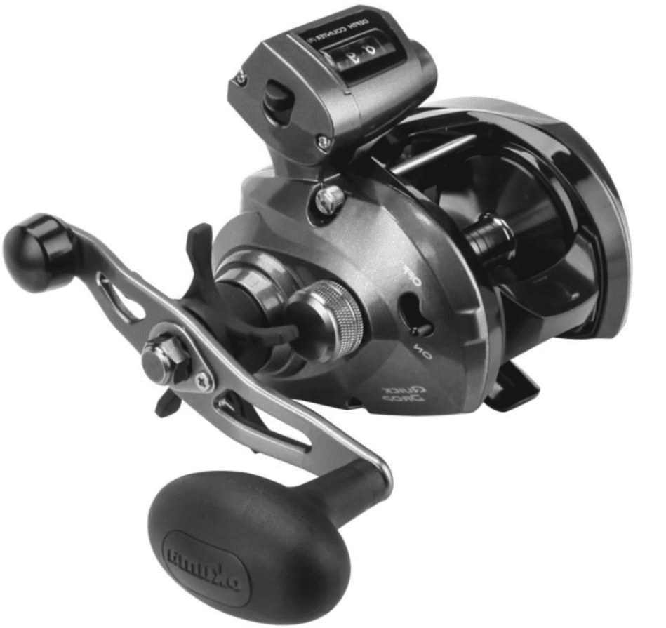 Line Counter-Baitcast-Rolle zum Schleppen mit cleverer Quick Drop-Funktion. Durch das Drücken der Daumentaste bei eingeschaltetem Quick Drop, wird die Spule freigegeben. Sobald der Druck von der Taste verschwindet, rastet die Spule automatisch ein.
