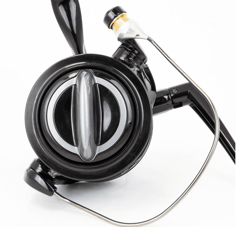 Bärenstarke Big Pit Angelrolle mit mattschwarzem Gesamtdesign für das Fischen auf große Distanzen und dem Erreichen von großen Wurfdistanzen.