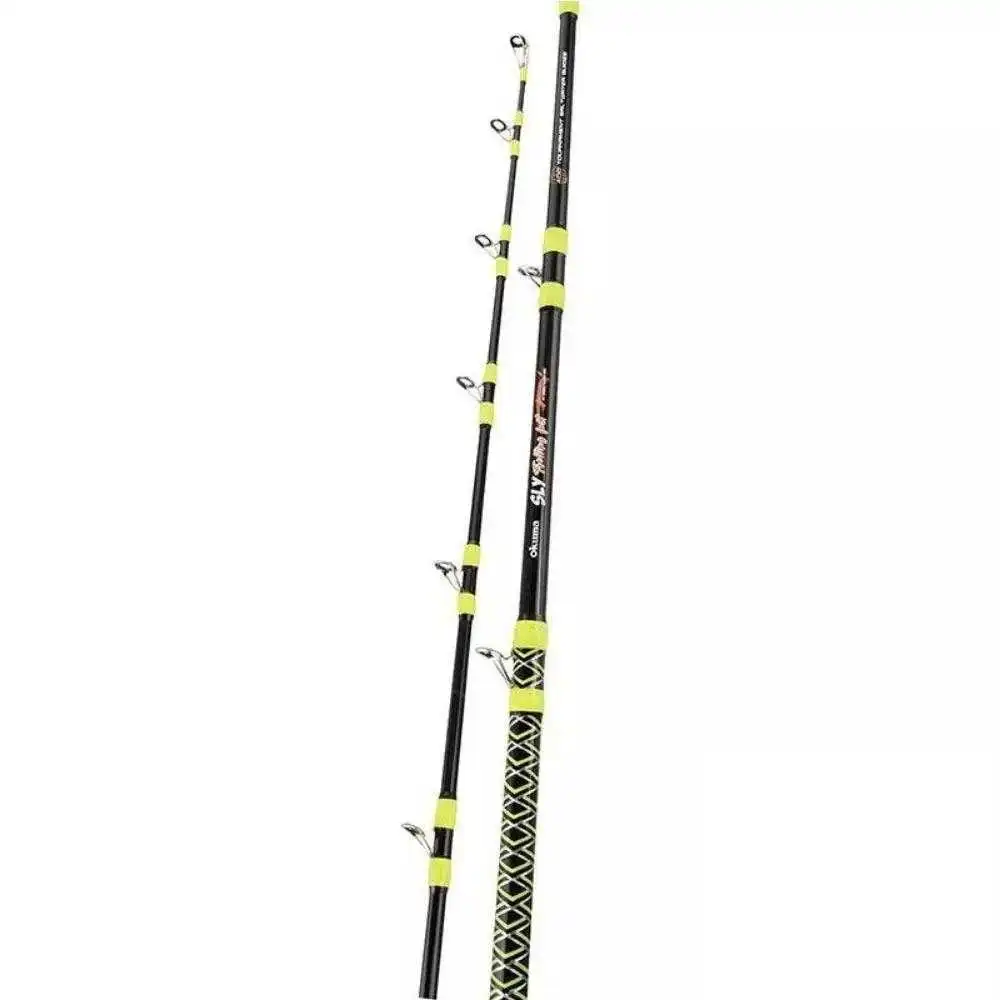Okuma SLY Rod verfügt über eine robuste E-Glas-Blank-Konstruktion, verwirrungsfreie Fuji K-Concept-Führungen mit Alconit-Einsätzen und spezielle Spiralführungen, die für alle Trolling- und Thunfischruten ausgelegt sind.