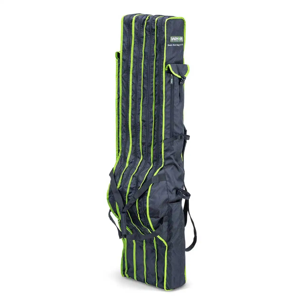 Diese vielseitig einsetzbaren Rutentaschen sind aus hochwertigem 600D Polyester hergestellt und zudem wasserabweisend. Die Basic Rod Bags sind mit 3 Fächern erhältlich. Zwei große Außentaschen bieten zusätzlichen Stauraum z.B. für Kescher. 4 aufgesetzte Taschen sind speziell zur Unterbringung von Erdspeeren vorgesehen. 4 Befestigungslaschen sind bestens dazu geeignet um einen Schirm oder ähnliches zu transportieren. Die stark gepolsterten Schultergurte ermöglichen das Tragen als Rucksack. Zusätzlich stehen noch 2 Tragegriffe zur Verfügung.